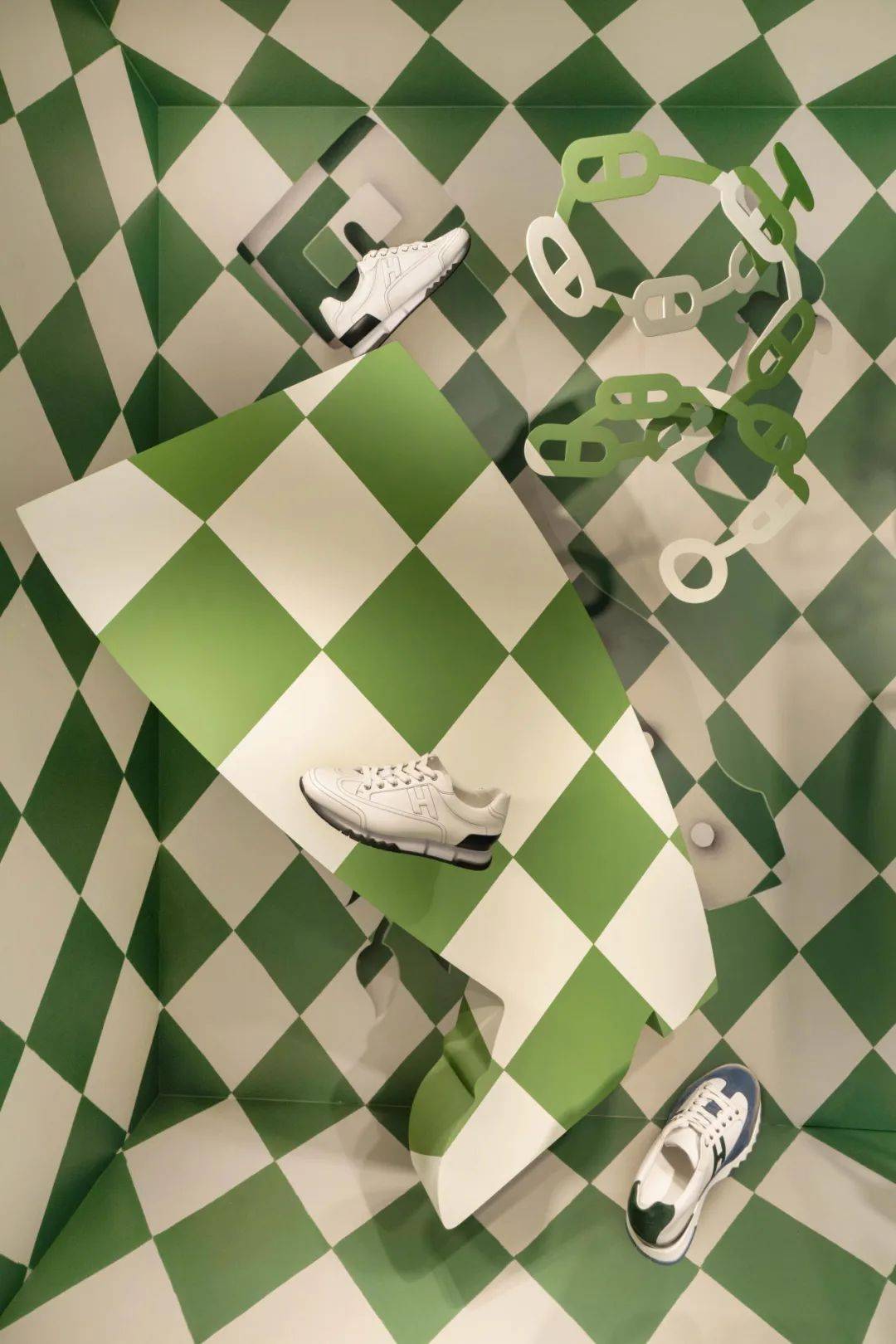 男性寰宇橱窗里,Trail 运动鞋行经绿意盎然的画面,以错视技法刻画的靴影映衬着轻疾的行动,内幕相生。灵动的蛇形腰带指向自然的复苏,后台图案的绿色菱格则溯源骑师夹克,致敬爱马仕的马术古代。© 爱马仕
